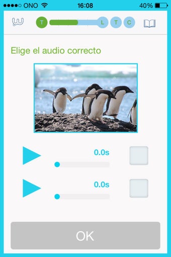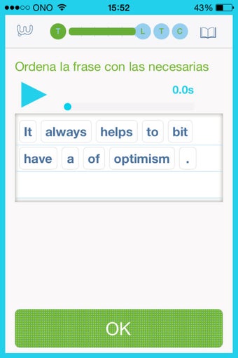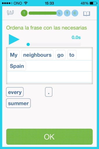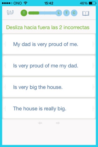 Un detalle a valorar muy positivamente es la variedad de las preguntas planteadas, de manera que no te resulte monótono. En un caso, por ejemplo, tendrás que agitar el teléfono hasta que aparezca una respuesta correcta, en otro tendrás que ordenar las palabras que aparecen desordenadas (y quién sabe si tendrás que dejar alguna fuera), en otro tendrás que eliminar las frases incorrectas, etc. Por otro lado, a las preguntas de texto se añaden fragmentos de audio para que elijas la versión correcta e incluso un apartado final donde grabar tu voz y practicar la pronunciación.